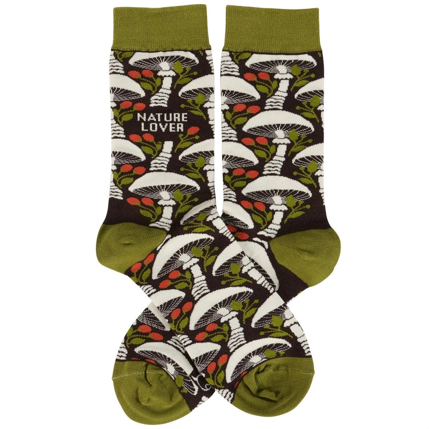 Give anyone that steps into personal space a vibe check with this pair of colorful socks displaying a relaxing mushroom pattern with an earthy sentiment that reads "Nature Lover."