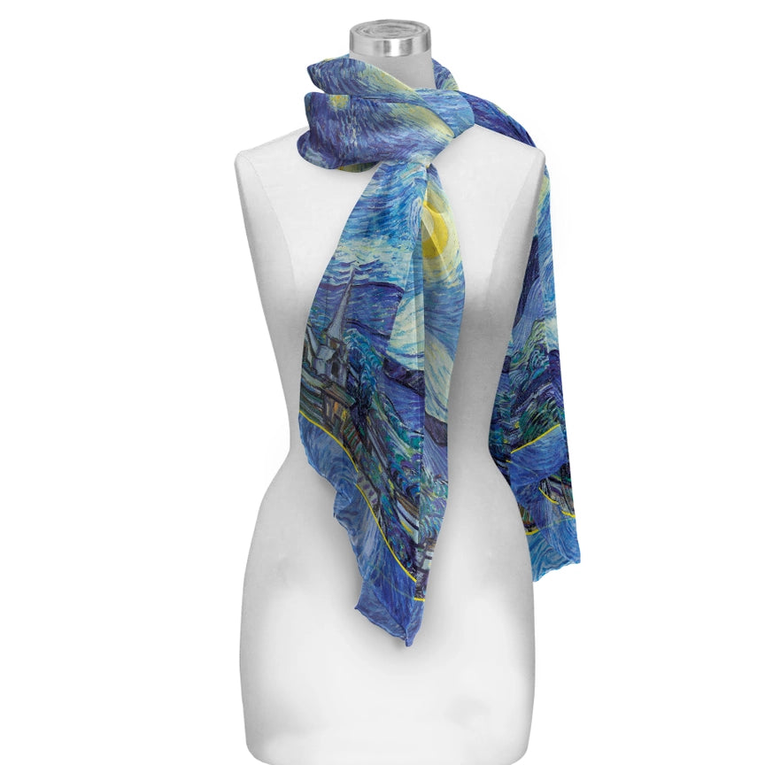 • FINE ART DESIGNS: Artfully chic RainCaper Fine Art Sheer Scarves are functional, fashionable and fabulous! Stunning rendering of van Gogh's famous oil painting, "Starry Night." The design is captured with an artist’s eye for detail, light, color. Art is on the front and on the back.